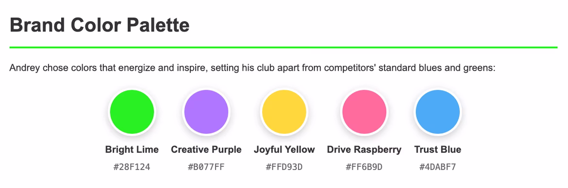- Additional: purple (#B0777) — about creativity and inspiration, balances the energetic lime, adding depth and seriousness so the brand looks not only fun but also thoughtful
