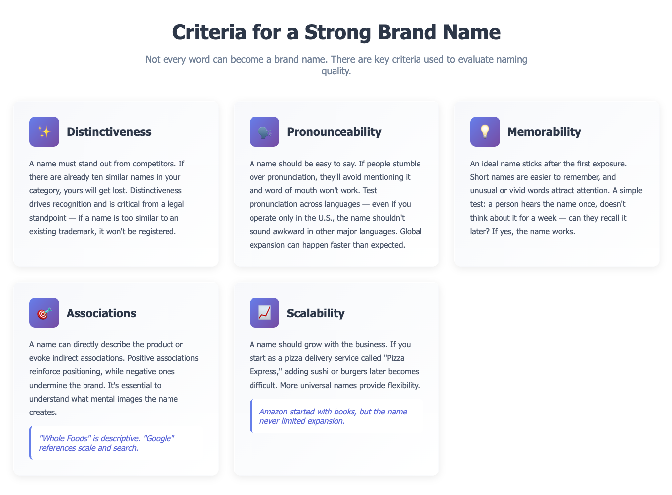 Not every word can become a brand name. There are key criteria used to evaluate naming quality.