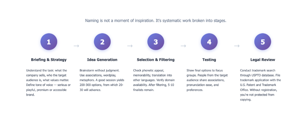 Techniques include associations, wordplay, root combinations, foreign words, and metaphors. Quantity matters. A strong session produces 200–300 options, from which 20–30 move forward.