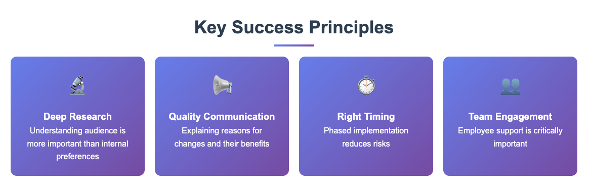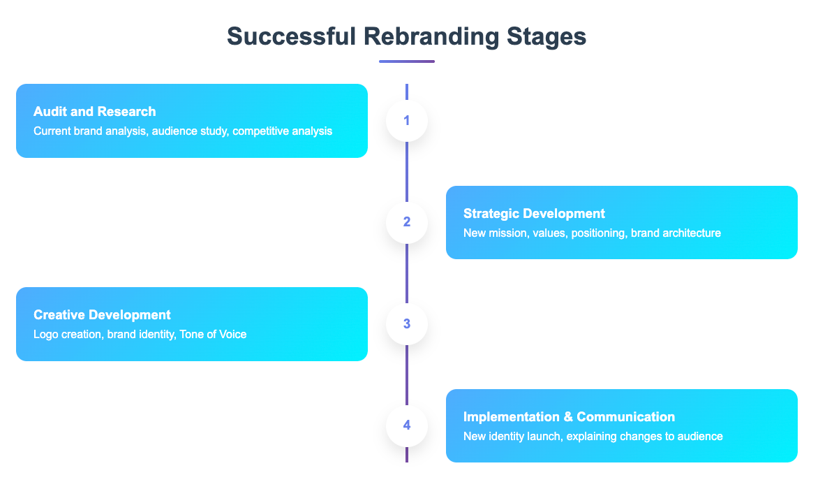 Skipping or rushing any stage dramatically increases the risk of failure. A visual refresh may take 3–6 months; a full rebrand often requires 1–2 years.