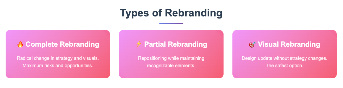 - Full Rebranding — the most radical, changing everything from strategy and target audience to name and visual identity.