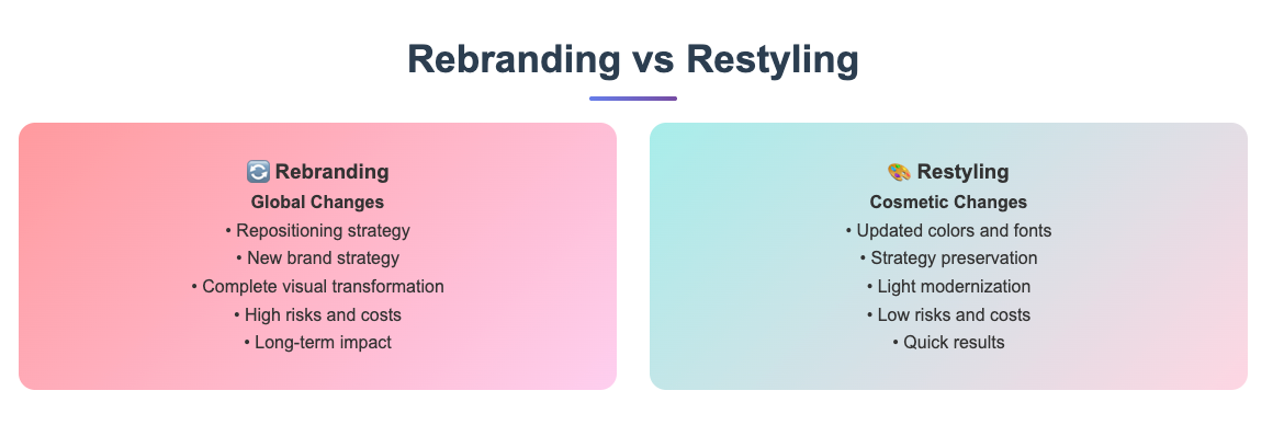 Rebranding, on the other hand, implies deeper changes: repositioning, redefining the target audience, or shifting company values. It’s more extensive and riskier.