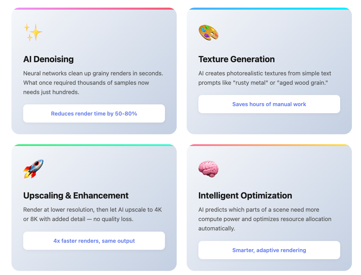 Neural networks remove noise from raw renders, cleaning up grain and artifacts without increasing render time. Tools like NVIDIA OptiX AI Denoiser are now industry standards.