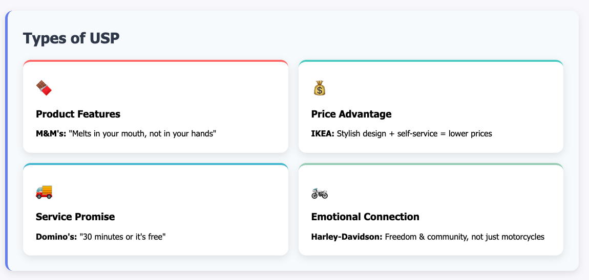 Businesses can build a USP in many ways. Some focus on product features, like M&M’s promise that their candies “melt in your mouth, not in your hands.” Others emphasize price and explain why it is lower, as IKEA does by combining stylish design with self-service and efficient logistics. Some brands stand out through service, like Domino’s Pizza, which once promised delivery in 30 minutes or it was free. And for others, the USP is emotional: Harley-Davidson doesn’t just sell motorcycles—it offers the feeling of freedom and belonging to a community.