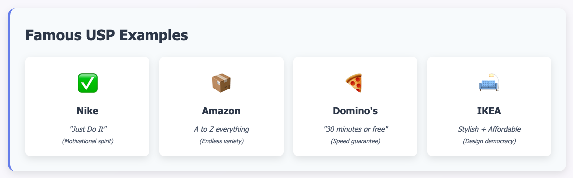 A USP can also rest on the way customers are treated. Domino’s Pizza once shook the market with its guarantee: delivery within 30 minutes or your money back. It wasn’t just food service; it was a promise of speed and reliability.