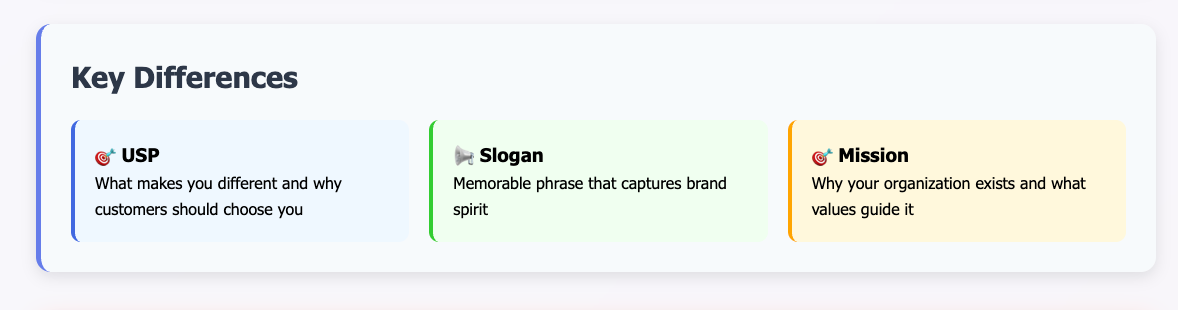 It’s easy to confuse a USP with a catchy slogan or a company mission, but they are not the same. A slogan is designed to be memorable and may echo the USP, but not necessarily. Nike’s “Just Do It” captures the brand’s spirit without saying what makes its sneakers different. A mission statement, meanwhile, explains why an organization exists and what values guide it, while a USP speaks directly to the customer, focusing on the benefit they get right now.
