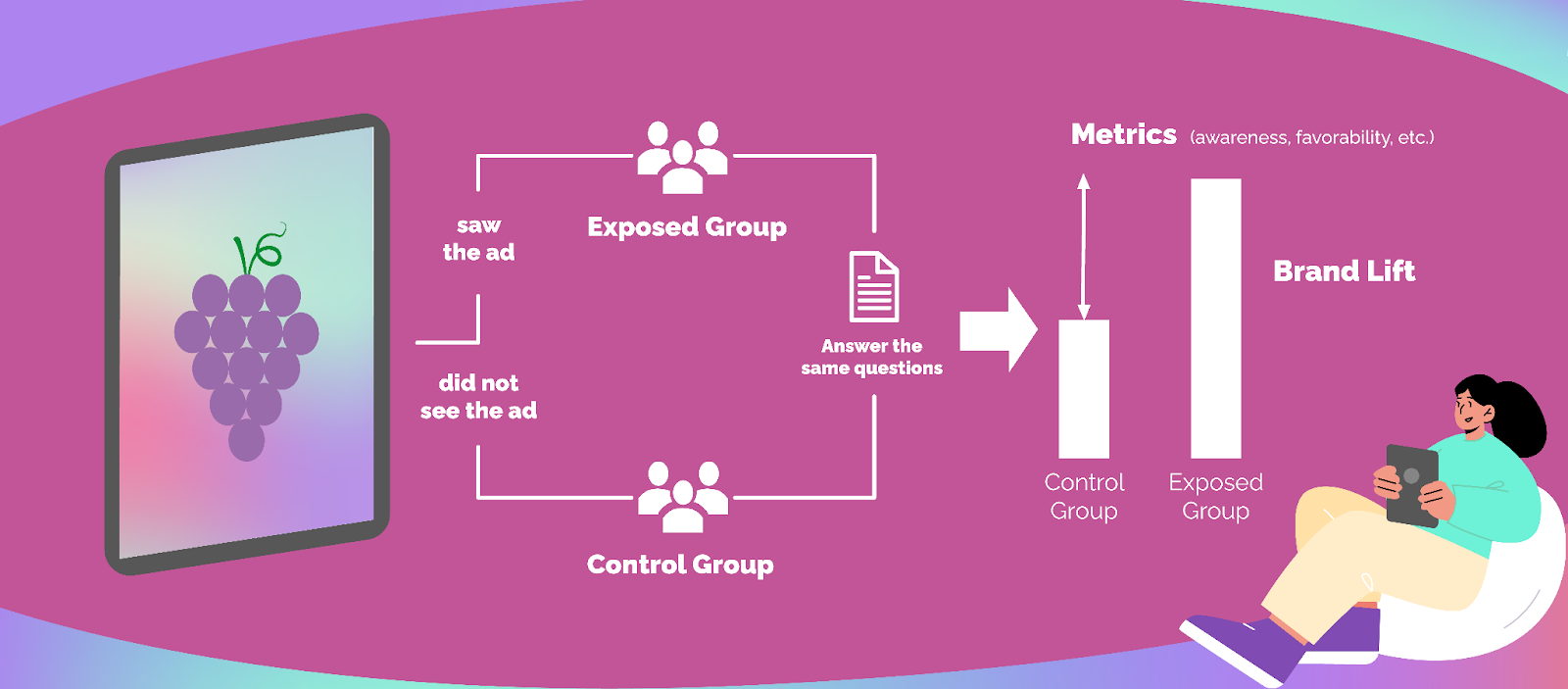 To measure brand recognition (among other things), marketers often conduct a Brand Lift Study. These studies are available through many major ad platforms. The mechanics of Brand Lift are simple: it’s a survey-based study where viewers are asked multiple-choice questions during or after viewing an ad. The questions appear directly in the video player or in place of a banner. All selected users fall within the same targeting criteria, but only the test group sees the ad, while the control group does not. Based on the responses, marketers can evaluate brand awareness, ad recall, message retention, and more among the target audience.