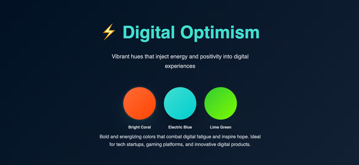- Digital optimism: bright coral, electric blue, lime green bring positivity to digital spaces.