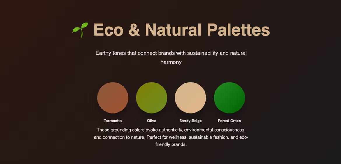 - Eco and natural palettes: earthy tones like terracotta, olive, sandy beige, forest green.